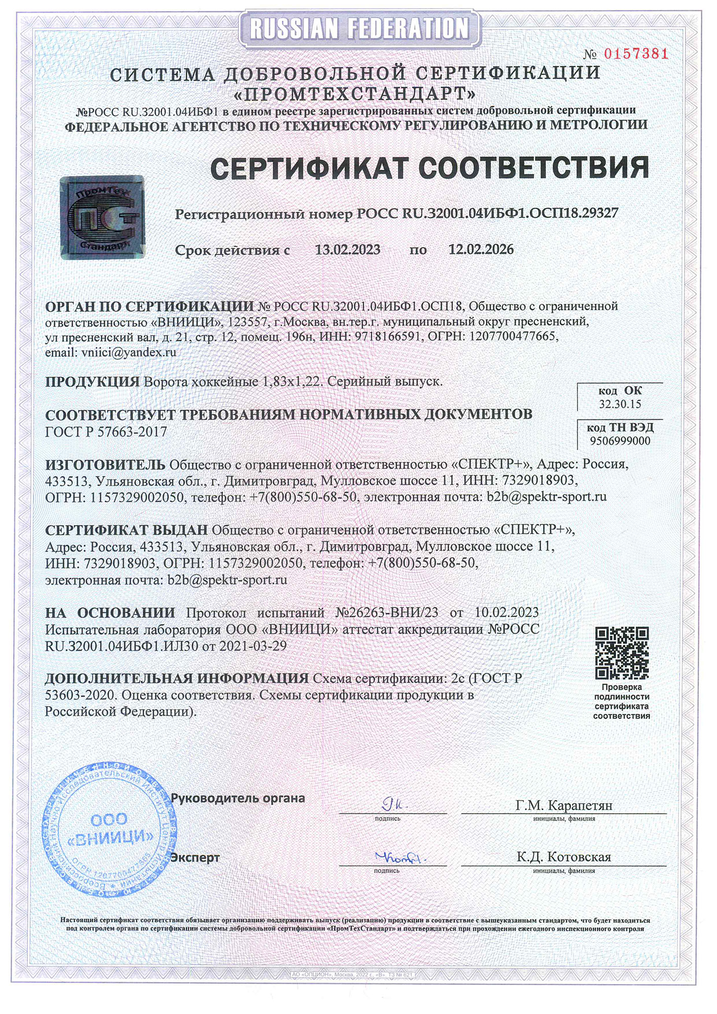 Сертификат соответствия (ворота хоккейные)